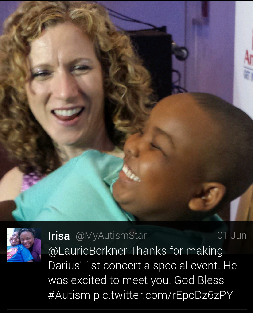 This past May, I followed Laurie Berkner, People Magazine’s queen of children’s music, on Twitter. Laurie sings and plays guitar in the Laurie Berkner Band. When Darius was 2 years old and receiving early intervention, his speech therapist would play videos from “We are…The Laurie Berkner Band” DVD. Even though he was nonverbal, he knew some of the words to the songs. His favorite tune was “We are the Dinosaurs.” Ever since then, Darius and I have been swimming with goldfish and dancing with pigs on our heads. Sometimes, I think I have more fun than Darius.